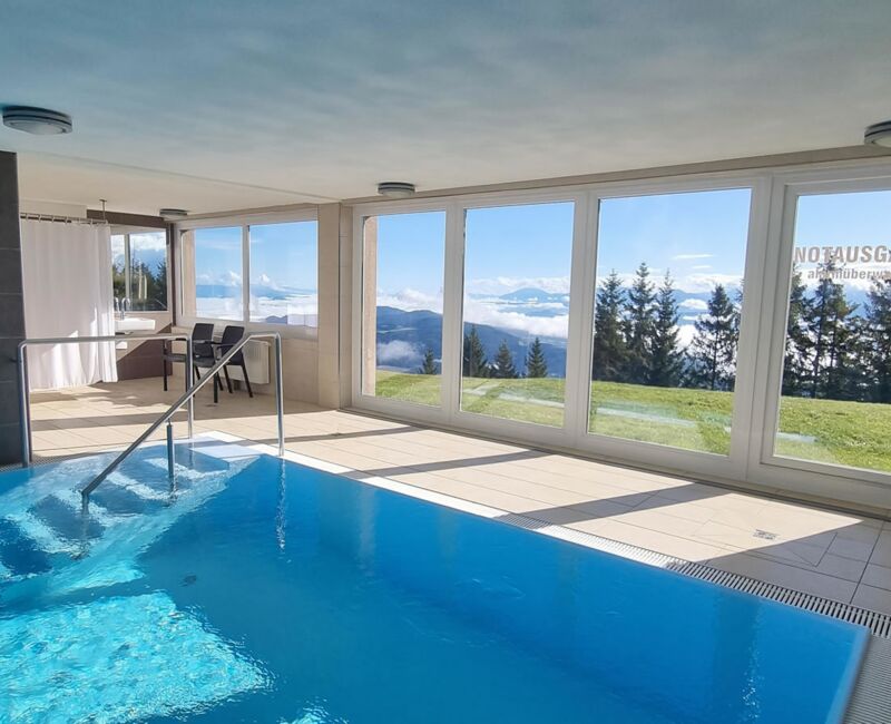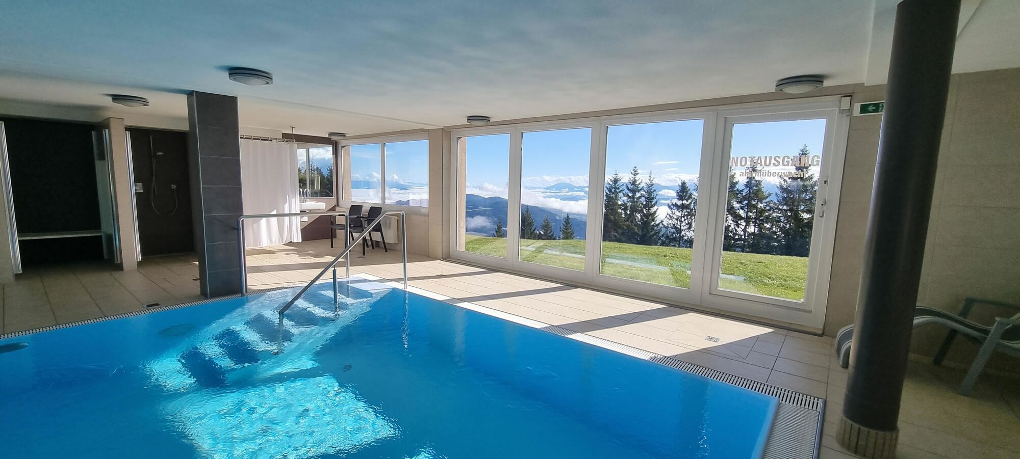 Und das Beste: Im Edelweiß gibt es ein eigenes Schwimmbad, das alle Hausgäste zu den Öffnungszeiten nutzen dürfen – der Ausblick beim Schwimmen ist grandios, also: Packt die Badehose ein!